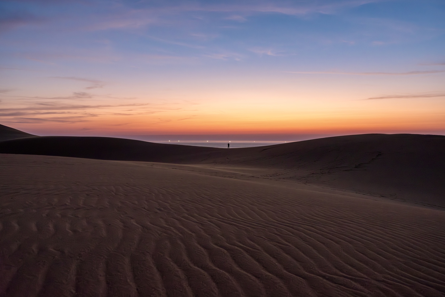 鳥取砂丘は訪れた誰もが魅了される風景です。絶景は必然に偶然が重なると出会える!この日もそんなシーンを期待していました。夕日が落ち、人もまばらな時間帯...私はここからの時間が一番好きです。めまぐるしく変わる空、風が作り出す風紋、海には漁火、ベストタイミングで歩いていく人。この偶然が砂丘の壮大さと、作品をドラマチックに仕上げてくれたと思います。フィルムシミュレーションは、柔らかな階調で彩度の高い「ASTIA/ソフト」です。空のグラデーションの美しさ、夕景の柔らかな空気感に色鮮やかな情景を表現してくれます。