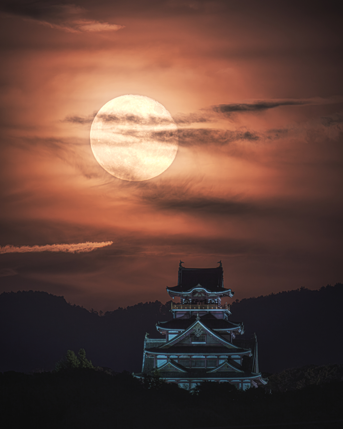 月の出時間の10分前に現地到着。あれ?なんでもう月が出てるの!?なんと・・・翌日の月の出時間と勘違いしてました。そんな時に焦って撮った1枚です。さて、選んだフィルムシミュレーションは「ETERNA/シネマ」。コントラストが抑えられるので、明るい月とほんのりライトアップな城のような高コントラストになりがちな場面で重宝しています。