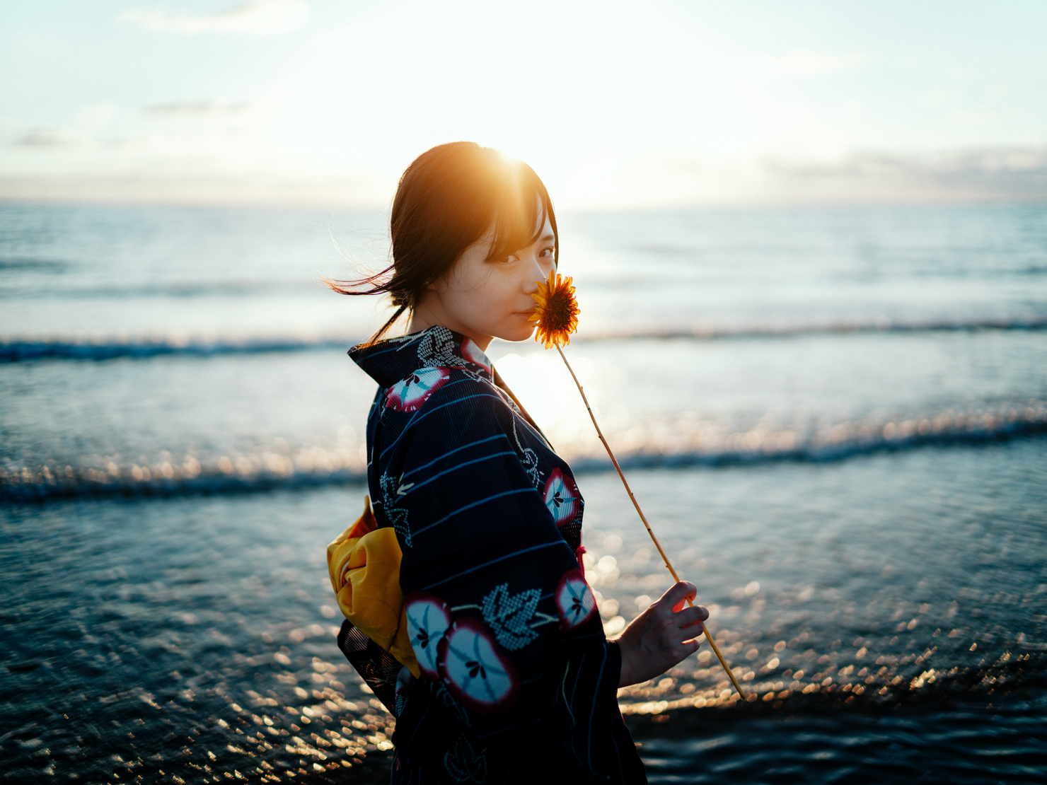 僕のポートレートには「存在してくれてありがとう」という想いを込めています。これは被写体の方や、写真を見てくださるすべての方に届けたい、僕なりの贈り物です。この撮影では、被写体さんが自然と繋がっているような姿を写したかったため、浴衣やお花の色が背景と調和するように選びました。彩度が強まる夕暮れ時、全体の色調とトーンを落ち着かせるクラシッククロームが、被写体と風景の調和を手伝ってくれました。